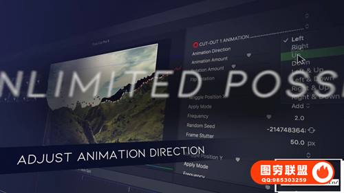 可定制的控件:您可以单独调整每个剪切的动画。首先,设置方向、数量和旋转。然后,如果您使用的是stutter预设,您可以调整每一层的蠕动运动。使用 Frame Stutter 滑块控制速度、数量,甚至以增量步长显示动画。