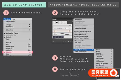 要求:Adobe Illustrator CC。 旧版本的 Illustrator 将无法使用。此画笔包使用了仅与 CC 兼容的新技术。
