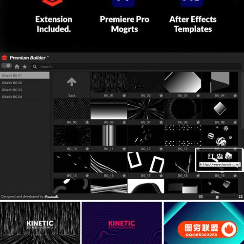 200种创意活力动感图形背景无限循环动画预设,提供脚本和模板两种方式。直接使用,可修改颜色等内容。CC 2020 – 2021 AE 兼容项目及以上,Premiere Pro 2020 – 2021 兼容项目及更高版本。包含 PremiumBuilder 脚本扩展工具,200 个动力学背景和200个 Mogrts。可调整大小的合成,每个组合的持续时间为 1 分钟,快速渲染,分辨率可调整。包含视频教程。
