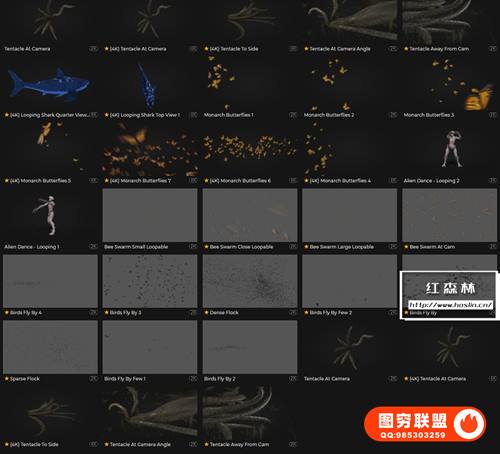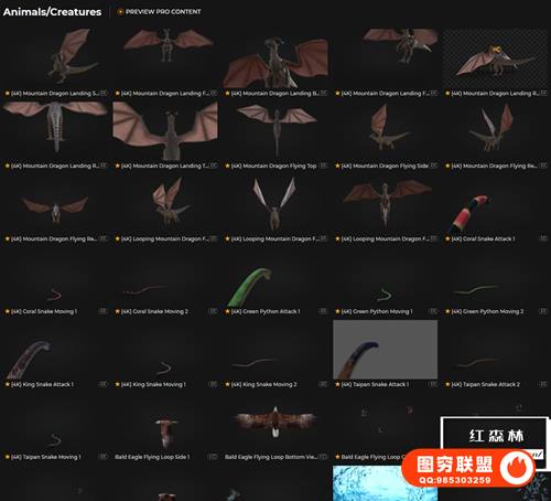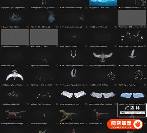 124个4K动物视频素材包括:鸟类、恐龙、触手怪物、鲨鱼、鱼、蝴蝶、蜜蜂、山龙、蛇、鹰等。所有动画素材都最适合您的视频编辑、动态图形、电影、动画和VFX合成需求。包含透明通道,无需抠像,直接添加到视频上即可使用。