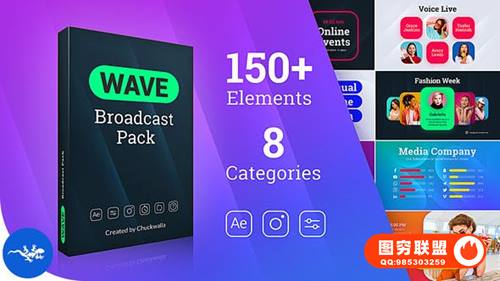 [AE模板]150个扁平化彩色图形节目预告导视社交媒体宣传介绍动画 Wave Broadcast Pack