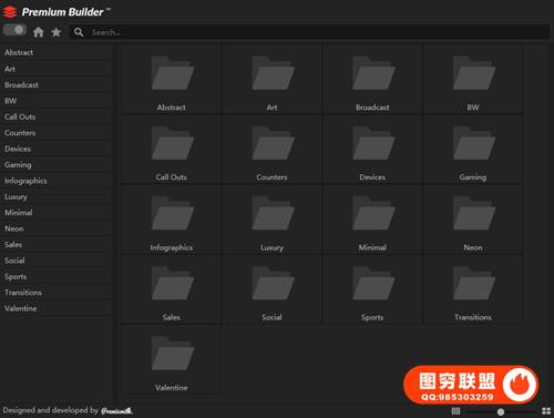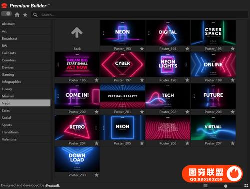 脚本模板包含17个类别:抽象、艺术、广播、黑白、呼出、计数器、设备、游戏、信息图、豪华、最小、霓虹灯、销售、社会、体育、转换、情人