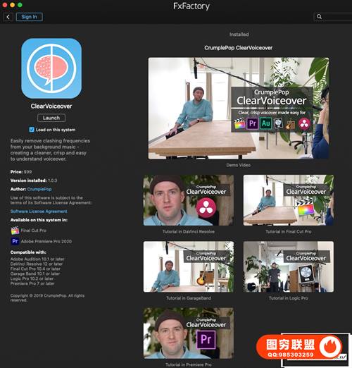 [FCPX/PR/AU插件]清晰画外音平衡配音背景音频处理插件 FxFactory ClearVoiceover 1.0.3