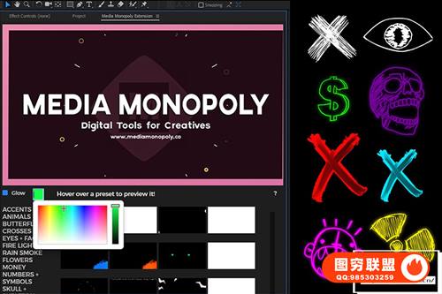 Ae扩展脚本多种内置工具,包括添加发光,颜色选择,预览等。.MOGRT文件允许在Premiere Essential图形面板中使用。