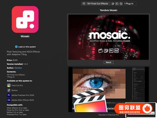 FCPX特效 Yanobox Mosaic,具有自适应平铺的像素纹理和 ASCII 效果。Mosaic 包括几个程序化配方,但最令人兴奋的用途是导入您自己的图案以创建惊人的图形效果。