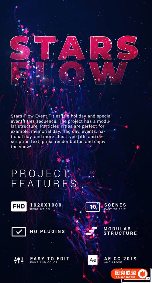 Stars Flow Event Titles是一个假期和特殊事件的标题序列。该项目采用模块化结构。粒子标题是完美的,例如,阵亡将士纪念日、国旗日、事件、国庆日等等。只需输入标题和描述文本,按渲染按钮即可欣赏节目!