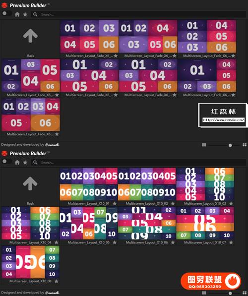 Multi Screen Layouts Pack包共有500多个带出入动画的分屏效果,可以给视频图片等素材制作动态分屏网格排列组合。脚本形式,直观能够看到预览效果,点击即可使用。可控制边框宽度倒角、占位符色调控制等,包括声音效果。动画输入 – 60 秒持续时间,包括2,3,4,5,6,8,10分屏效果。