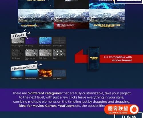 有 5 个完全可自定义的不同类别,32个完全可定制的不同动画,将您的项目提升到一个新的水平,只需点击几下,即可让一切保持您的风格,只需拖放即可在时间线上组合多个元素,非常适合电影、游戏、视频社交等。 可能性是无止境的。