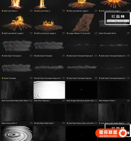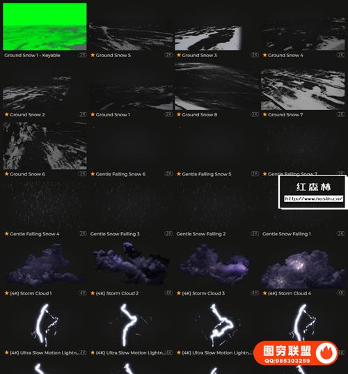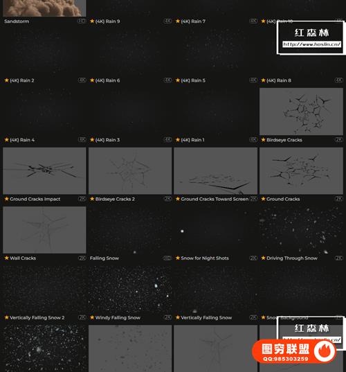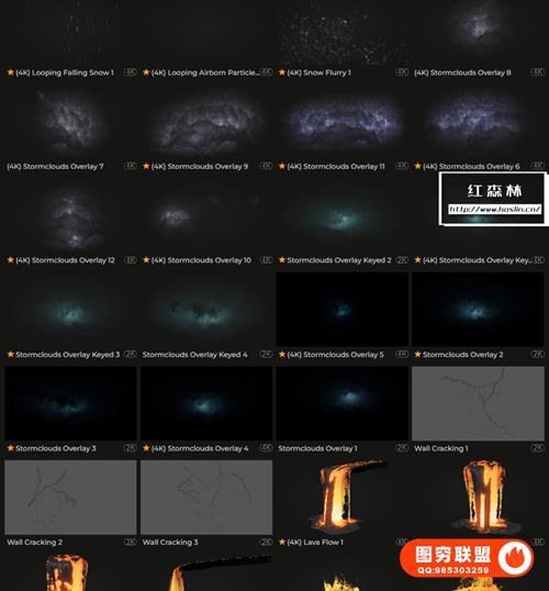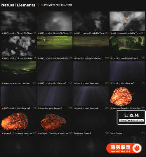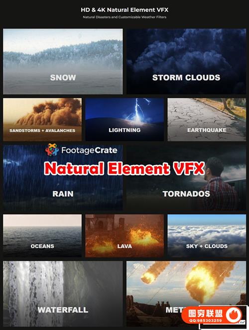 Natural Elements VFX包含数百个自然灾害和可定制的天气构建视频动画素材,如下雪,乌云,沙尘暴,闪电雷电,地面破碎,下雨,岩浆,云层,水流,海面,雪山,陨石坠落等。部分素材包含Alpha通道或绿幕,直接拖放到时间线上即可使用。