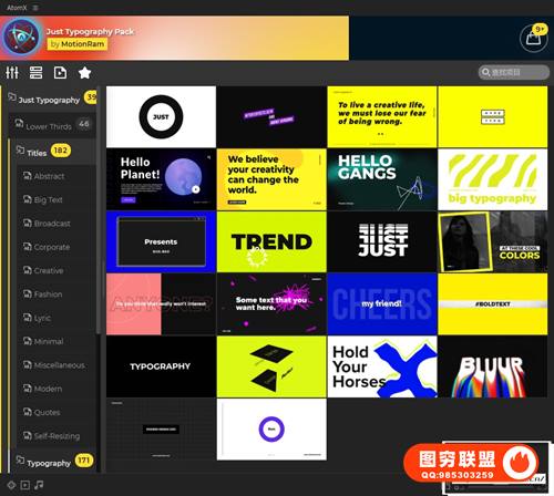 Just Typography Pack 最新V3包含550个AE预设+400个PR预设。提供时尚创意字幕条标题排版设计文字动画。文字内容可以随意修改,使用AtomX脚本调用预设,可视化预览,点击即可使用,文字内容颜色大小位置均可修改。