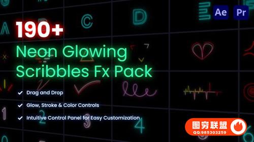 图穷联 » [AE/PR模板]190种霓虹发光线条涂鸦图形字符预设包 Neon Glowing Scr