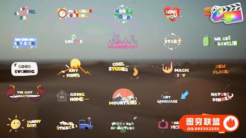 图穷联 » [FCPX插件]25种缤纷甜美VLOG旅行游记卡通文字标题动画 Travel Sticke