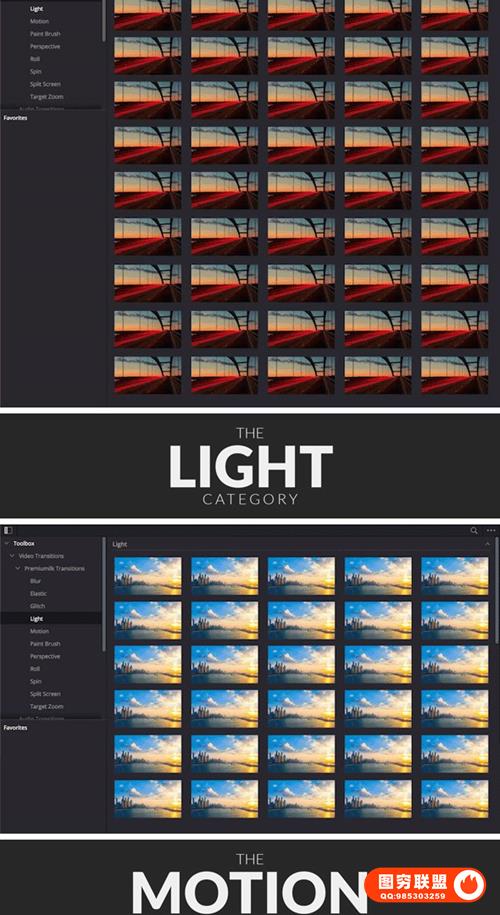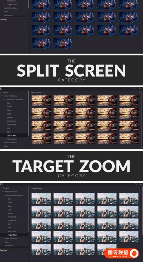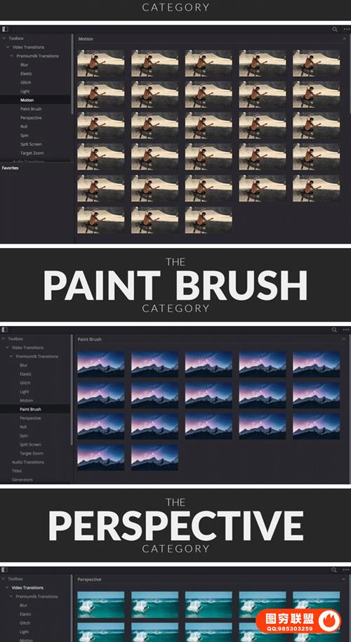 The Most Useful Transitions Pack DR 拥有十一大类(模糊,弹跳,故障,光效,运动,笔刷,透视,滚动,旋转,分屏,目标缩放)超过300个转场预设,包括音效,支持快速预览快速渲染。可调整大小,支持8K、6K、高清、移动、正方形分辨率,包含视频教程。