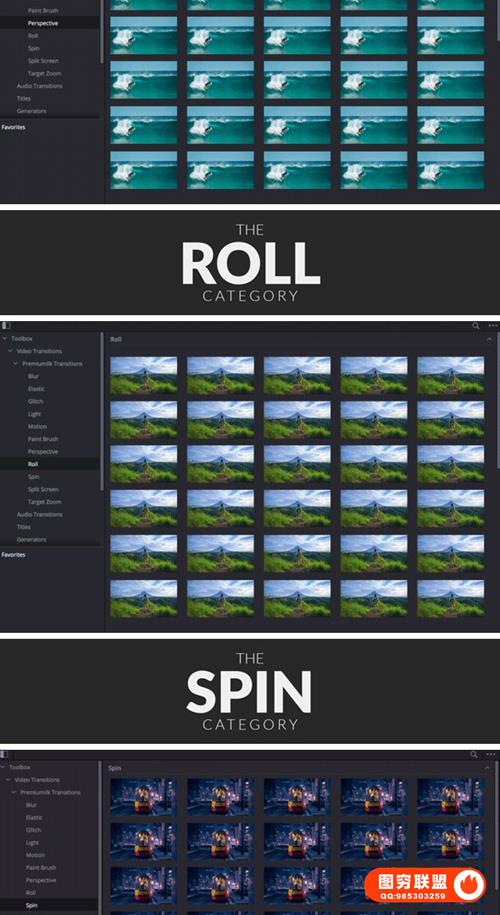 图穷联 » [达芬奇模板]300种缩放故障光效移动旋转变形分割混合转场预设 The Most Usef