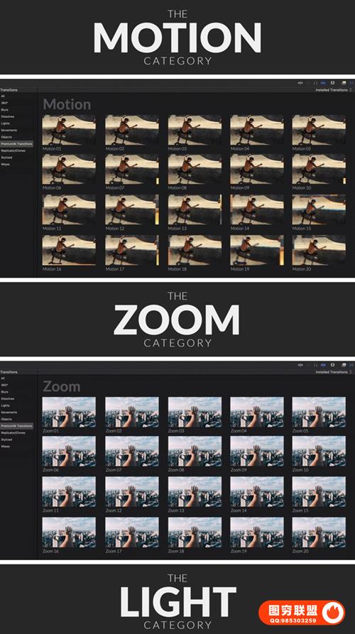图穷联 » [FCPX插件]200种缩放故障光效移动旋转变形分割混合转场预设 The Most Use