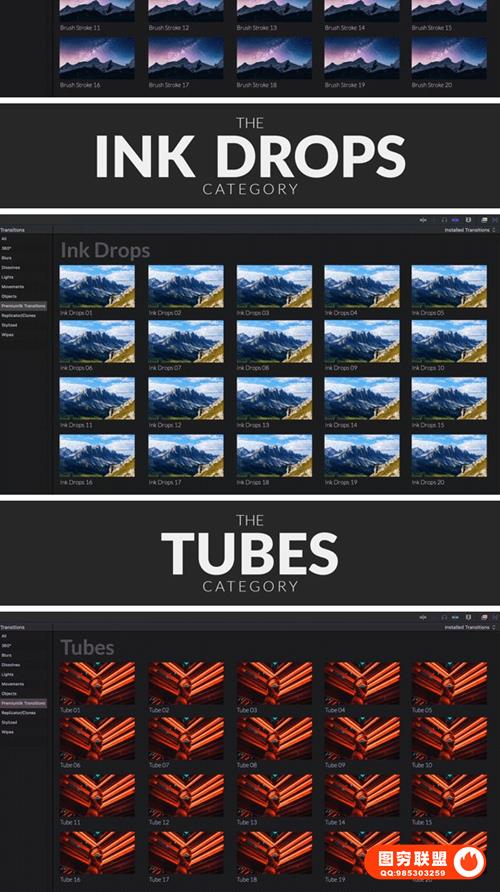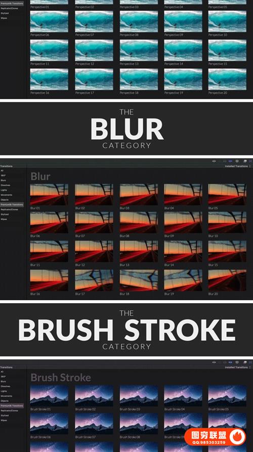 The Most Useful Transitions Pack FCPX 拥有九大类(运动,缩放,光效,弹跳,透视,模糊,笔触,水墨,Tubes)超过200个转场预设,包括音效,支持快速预览快速渲染。可调整大小,支持4K、高清、移动、正方形分辨率,包含视频教程。