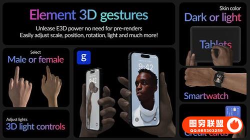 图穷联 » [AE模板]15种E3D设备界面触控缩放点击滑动手势动画 Real Hand Gestur