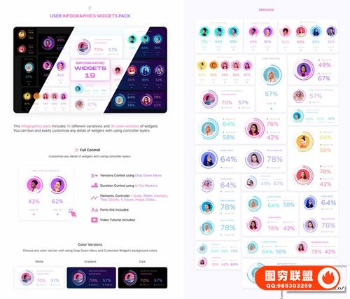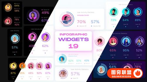 此用户活动信息图表小部件包包括 19 个不同的信息图表小部件,具有 3 种颜色版本。易于编辑,轻松自定义编辑任何图形元素,使用标记控制持续时间。包含图像和字体链接,无需插件含视频教程。