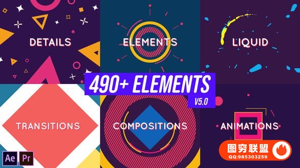 [AE/PR模板]490组线条圆圈爆炸波浪气泡液体运动图形MG元素转场叠加动画 Shape and Motion Animated Elements Pack