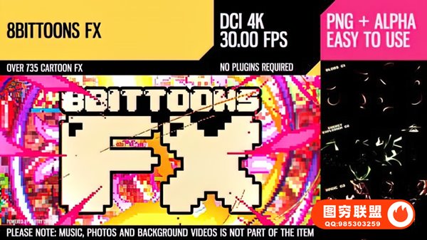 使用 8BitToons FX 回到 90 年代。8BitToons FX包含高清 UHD (1920*1080)、QuickTime(PNG、Alpha 通道、30fps)的 735×2 快速动画。为您的项目添加复古外观和现代动态。您可以自定义颜色并在流行软件中添加一些发光效果:After Effects、Premiere Pro、Edius、Final Cut、Vegas Pro、Resolume 等。所有效果均以两种变体呈现。
