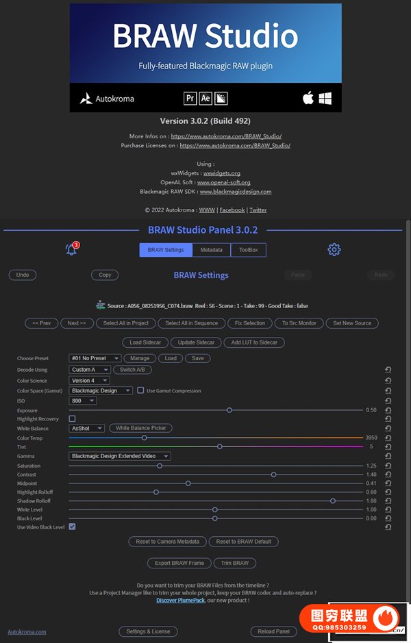 BRAW Studio是一款适用于Adobe Premiere Pro和Media Encoder的全新Blackmagic RAW(.BRAW)素材导入器!使用这个插件可以将Blackmagic RAW(.braw格式)的素材直接导入到After Effects, Premiere Pro 和 Media Encoder软件中,还可以进行一些参数的设置。