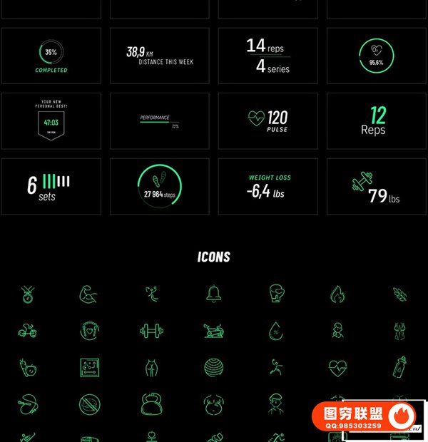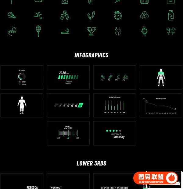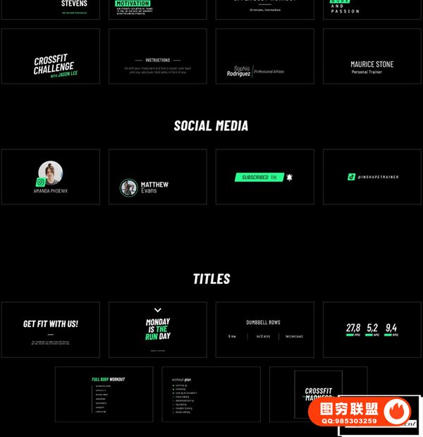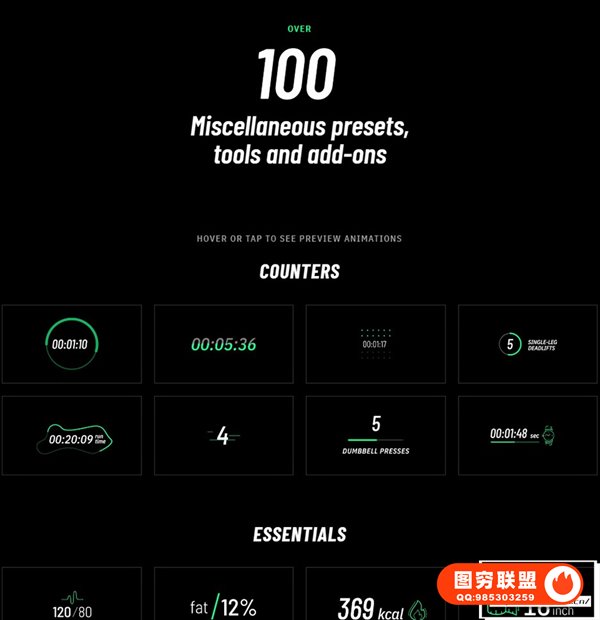 mFitness 拥有约106个动画预设,包含数字倒计时,计数器,图形数据,运动图标,文字标题字幕条等。带出入动画(可关闭),能修改文字,颜色,大小位置等属性。