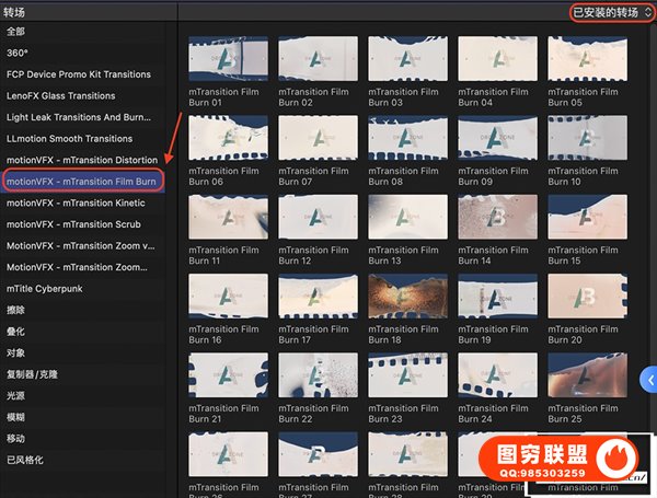 图穷联 » [FCPX插件]30种电影胶片灼烧溶解失真遮罩转场预设 motionVFX -mTrans