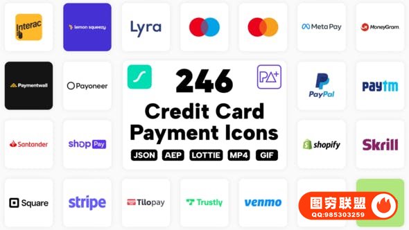 246 个基于矢量的动画信用卡和支付 Lottie 图标集合,与动画 Lottie 图标完全兼容,为您的项目制作轻量级、可扩展的动画。包括 JSON、AEP、dotLottie、MP4 和 GIF 版本。包含世界上常用的各种支付方式,如各国货币,比特币,银联信用卡,Visa信用卡,万事达卡,非接触支付,支付宝,苹果支付,Paypal,微信支付等等。使用 Lottie Editor 或 After Effects 项目轻松定制。