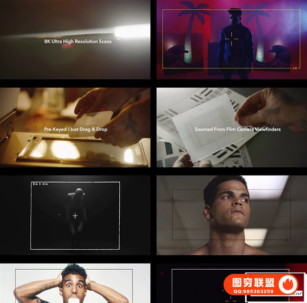 100多种取景器叠加镜头效果,磨砂玻璃来源于35mm电影取景器,预键控Alpha PNG/只需在镜头上拖放即可。每个取景器都是分层的(有/没有十字线)每个效果均包括4个版本(黑色/白色/红色/黄色)分辨率:4K/1080P(HD);文件大小:290M