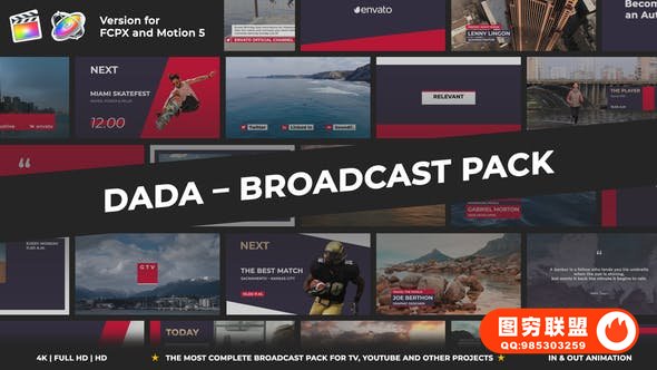 DADA – FCPX Broadcast Pack 是适用于媒体新闻频道、电视节目和任何社交网络的最大动态图形项目。非常适合设计您的社交媒体内容和个人资料页面。它包含广播开场动画,接下来播放,平面信息标题,字幕条动画,多用途动画,简介字幕条,社交媒体标题,带占位符的转场过渡和上部字幕条9个部分,120+元素,现代简约而独特的设计,非常容易编辑。