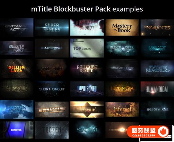 mTitle Blockbuster Pack 是一组文字片头动画,非常大气震撼,我们在一些好莱坞电影中经常看见影片片头那种大气磅礴的文字片头,会有一种超强的视觉效果。mTitle Blockbuster Pack 包含30种不同的电影文字片头特效,修改文字即可使用。你还可以根据剧情或自己的需要做其他调整,以达到更完美的效果,操控和使用都非常简单,希望你的影片和好莱坞巨制一样专业,震撼和迷人!