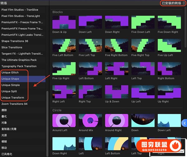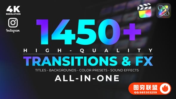[FCPX插件]1450个拉伸旋转缩放图形水墨光效VHS故障分割转场特效调色标题动画 Unique Transitions & FX v8