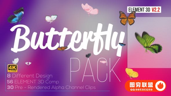Butterfly Pack 拥有8种不同的蝴蝶设计,56种Element 3D合成,30个预渲染的Alpha通道循环剪辑,包含视频教程。 4K 3840×2160 超高清分辨率,需要After Effects CC 及更高版本。