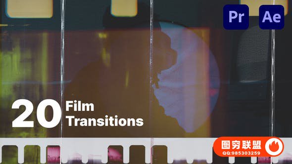 [AE/PR模板]20种复古老电影胶片穿孔灼烧闪烁刮痕转场预设 Film Transition Pack