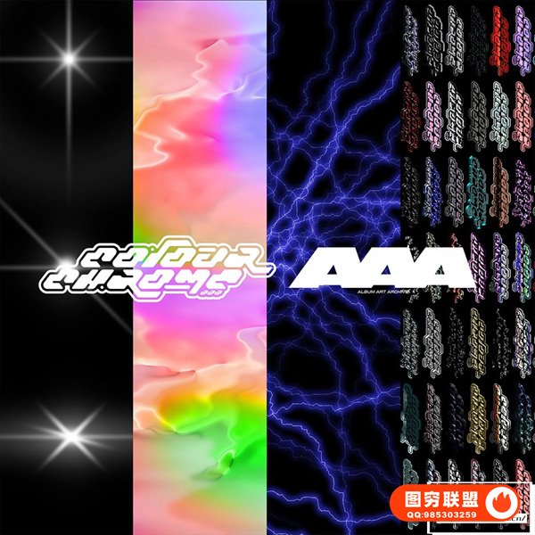 400+炫彩发光金属镀铬锡箔反射纹理特效Logo文本图层样式闪电抽象图形PS设计套件 Album Art Archive – Colourchrome