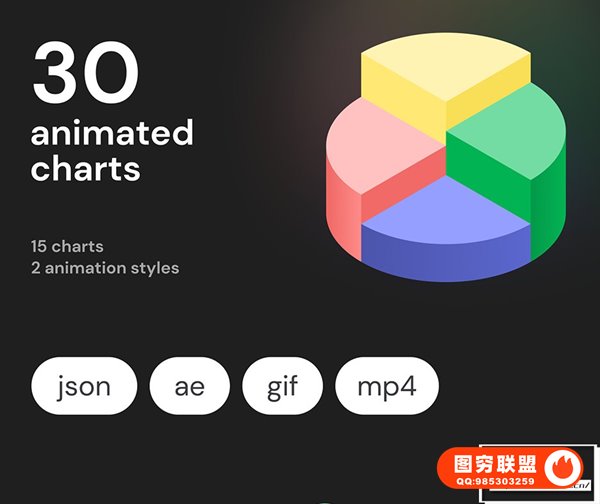 30 个动画图表:15 个图表 2 种循环动画风格。非常适合入门、登陆页面、移动应用程序、网站、广告、网站、社交媒体或演示。