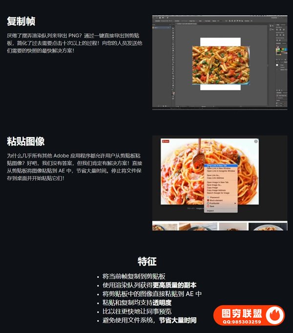 Copy Pasta是一个用于Adobe After Effects的脚本,它提供了简单而高效的复制和粘贴图像的功能。可以让AE和其他软件间复制粘贴图形图片,舍去了麻烦的导入导出,节约时间,提高效率。