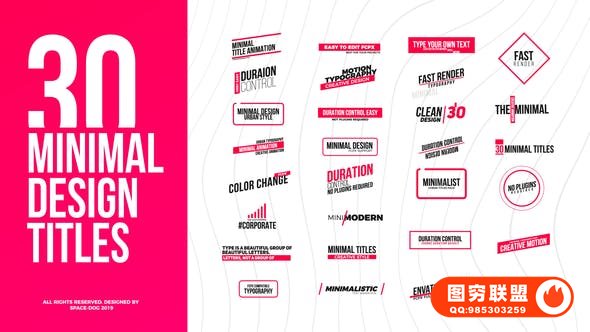 Minimal Design Titles 拥有30种迷你简洁设计文字标题动画,带出入动画(可关闭),文字支持中文和英文输入,可修改文字字体,位置,颜色,大小,旋转,透明度,阴影,以及线条线框的颜色大小等,标题均带通道,能和你的视频更好的融合。