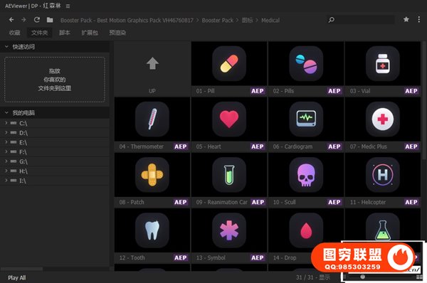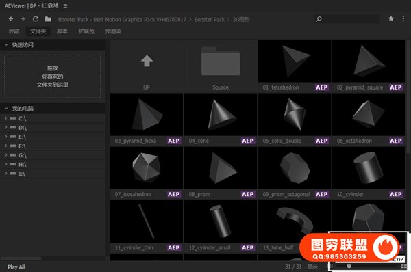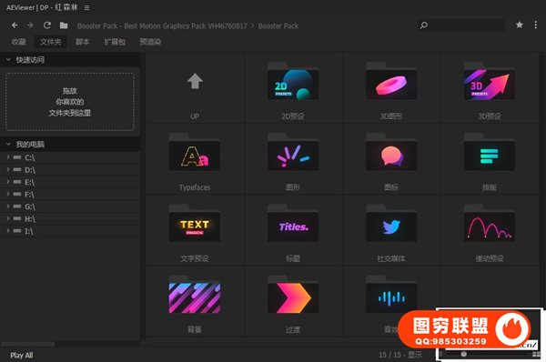 Booster Pack是最适合After Effects的动态图形包,拥有超过3000个元素15众类别。它包括视频的所有基本组件:排版、背景、过渡、缓动预设、大量2D、3D和文本预设、社交媒体图形、动画字体、图标等等。所有图形元素的设计都经过精心设计和对细节的关注,以确保它们具有令人难以置信的用户友好性并适合所有级别的专业知识。只需点击几下即可完成任何运动任务。使用AEViewer脚本调用,可视化管理预览直接点击即可使用。