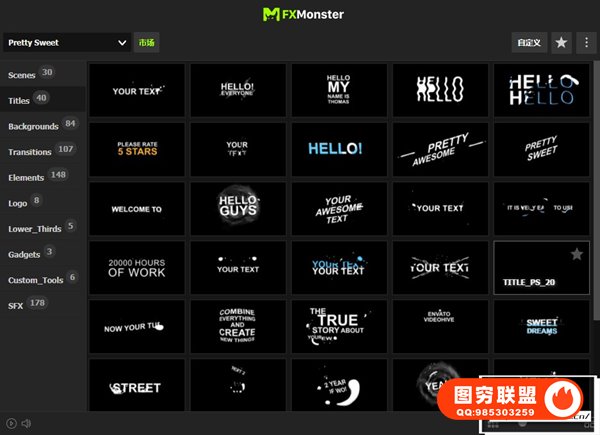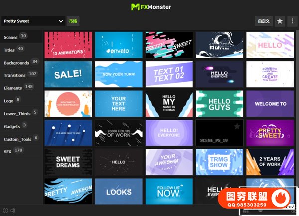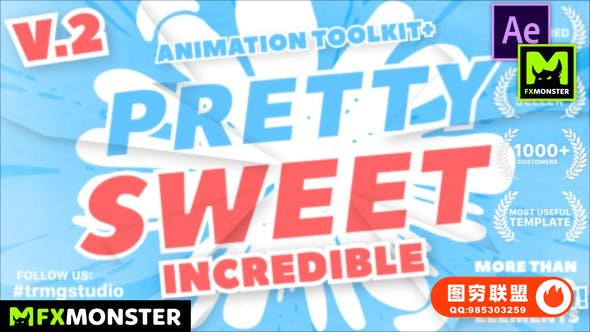2D Animation Toolkit 使用FXMonster脚本加载使用预设动画,拥有609个手绘卡通流体MG动画,如场景标题,文字标题,图形背景,转场,图形元素,LOGO片头,字幕条,音效,工具等。直接在脚本中可视化预览效果,需要什么动画点击即可加载到合成中,能够修改颜色大小位置,文字和LOGO均可自定义修改,支持中文输入;元素也可以自由组合搭配使用,创建更多可能。