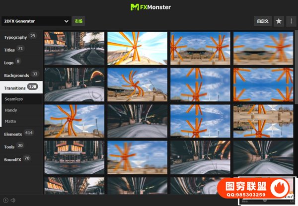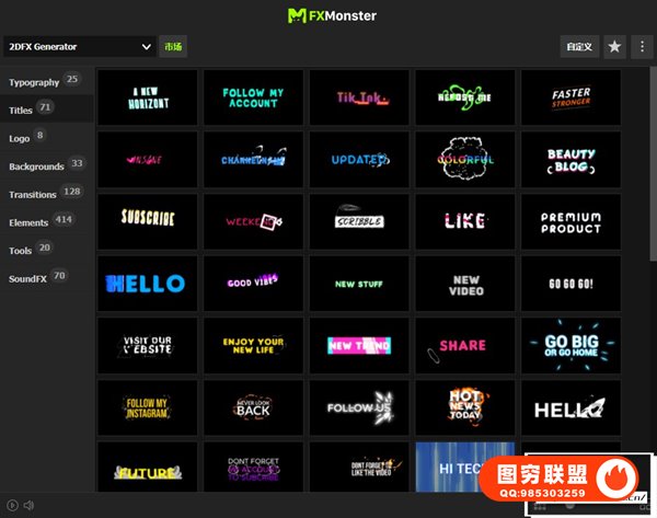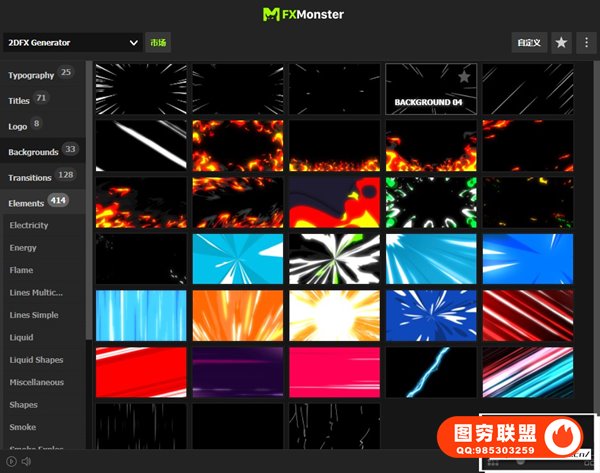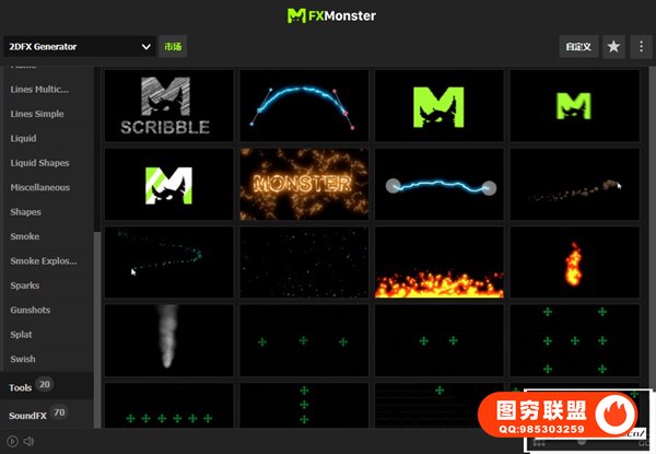 使用FXMonster脚本加载使用预设动画;强大的2DFX动画项目v1.2,拥有超过769个MG动画元素:场景文字,文字标题,LOGO片头,图形背景,转场,音效,工具,能量电流火焰线条流体烟雾闪光等图形动画。直接在FXMonster脚本中可视化预览效果,需要什么动画点击即可加载到合成中,能够修改颜色大小位置,文字和LOGO均可自定义修改,支持中文输入;元素也可以自由组合搭配使用,创建更多可能。