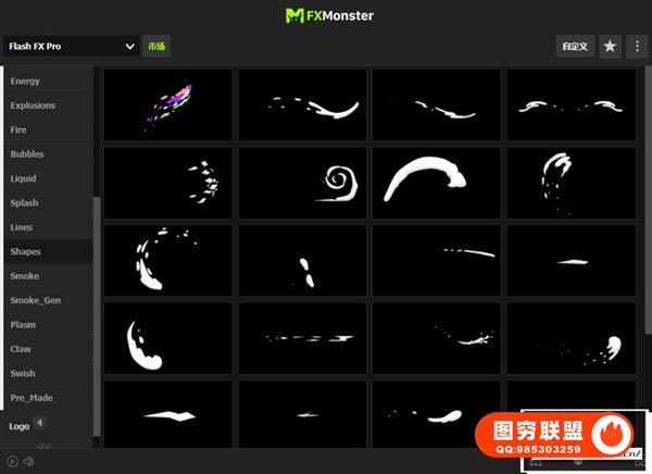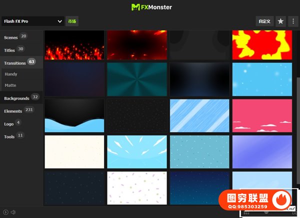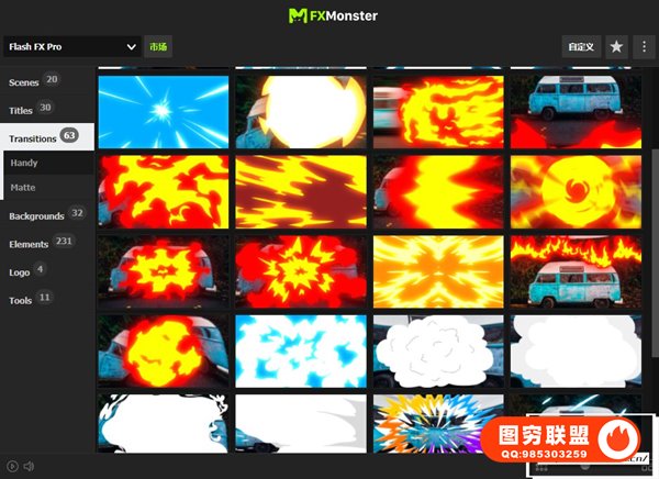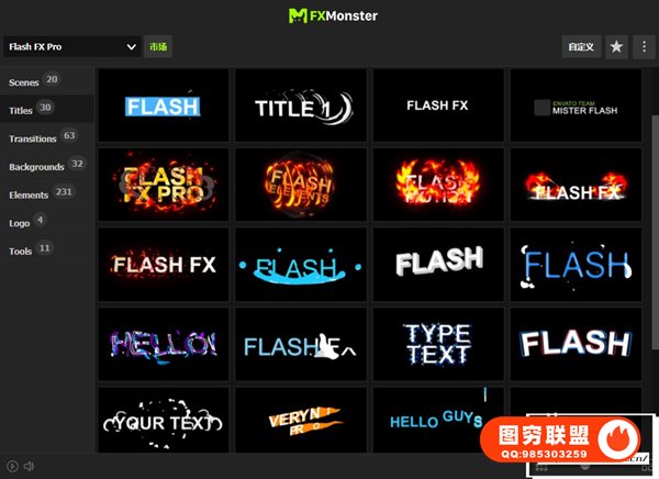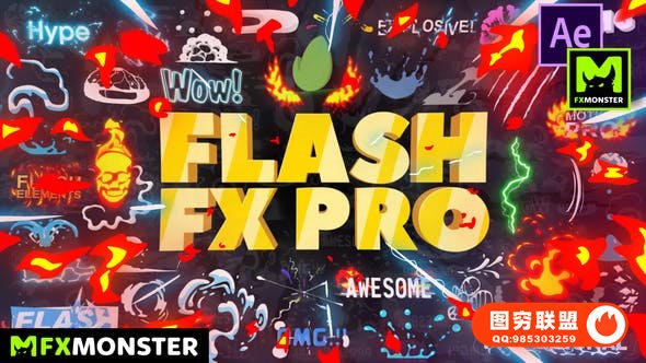 Flash FX Pro – Animation Constructor 使用FXMonster脚本加载使用预设动画,拥有391个动漫卡通MG动画,如电流能量,爆炸,火焰,烟雾,图形,背景,LOGO标题等。直接在脚本中可视化预览效果,需要什么动画点击即可加载到合成中,能够修改颜色大小位置,文字和LOGO均可自定义修改,支持中文输入;元素也可以自由组合搭配使用,创建更多可能。