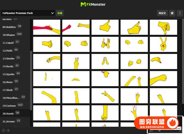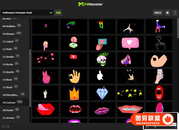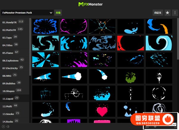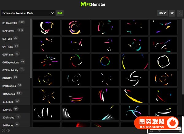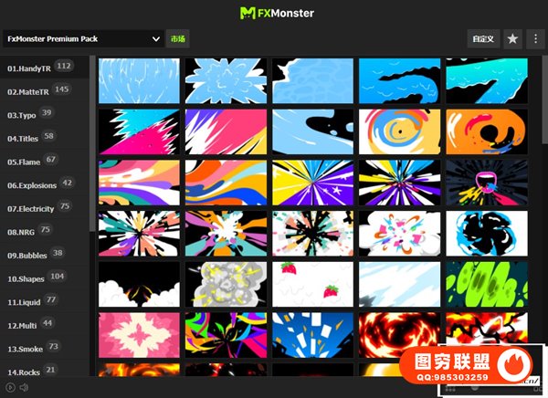 FX MONSTER – Premium Pack 现在可以使用原版FXMonster脚本加载使用预设动画了!强大的2D FX动画项目,拥有超过1650个MG动画元素:图形转场,文字标题,燃烧火焰,烟雾,爆炸,能量电流闪电,流体动画,线条图形,石头火星,霓虹发光,剑气,卡通贴纸图形,手势动画,箭头,LOGO片头,背景,音效等各种图形动画。直接在FXMonster脚本中可视化预览效果,需要什么动画点击即可加载到合成中,能够修改颜色大小位置,文字和LOGO均可自定义修改,支持中文输入;元素也可以自由组合搭配使用,创建更多可能。