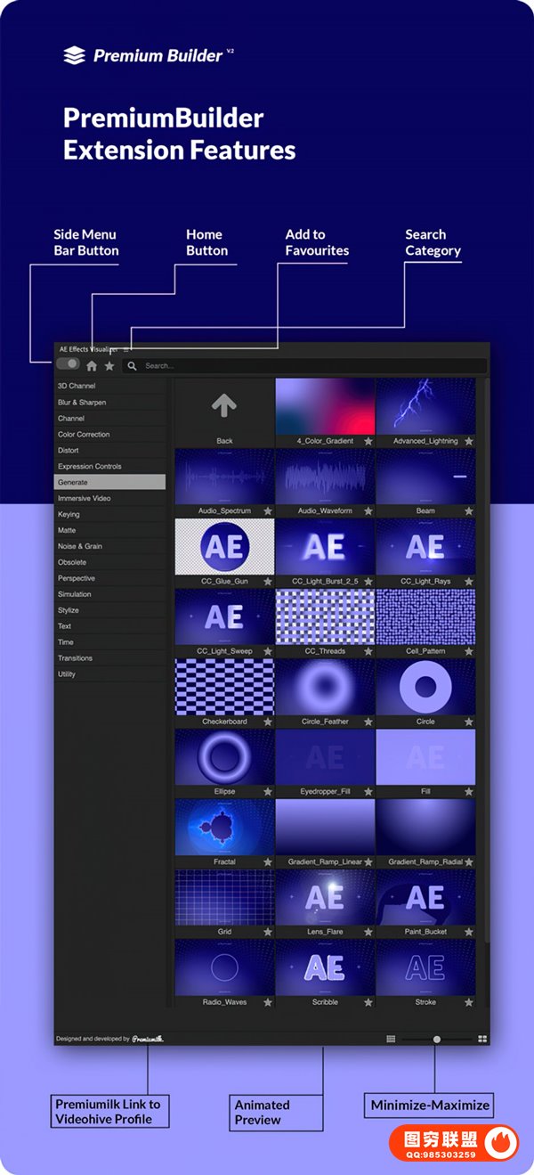AE Effects Visualizer 是一款由PremiumBuilder脚本扩展可视化效果预览组合实用多功能视觉特效包。拥有超过290种视觉特效,包含:转场、标题、扭曲变形、模糊锐化、色彩校正等效果预设。组织良好的可视化预设库,直接点击即可应用到视频上,非常方便。