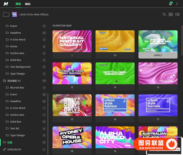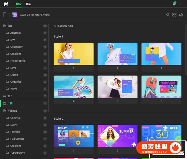 Lava Social Media Pack V3 包含8各类别的600多种场景动画,时尚、城市、体育、旅游、商业、设计、活动等主题的预制演示。使用Motion Bro4汉化脚本调用,操作简单方便,双击即可加载到时间线。