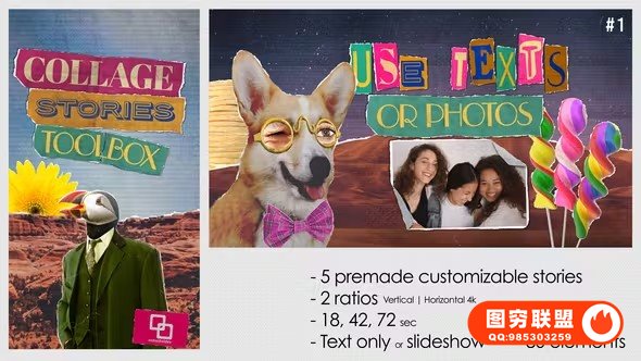 Collage Stories Toolbox 一个致力于您的拼贴艺术品的手工项目。包括两个分辨率(水平 4k 和垂直)。您可以使用 1 到 5 个预制故事(从 18 秒到 1 分钟 12),也可以从头开始完全创建自己的故事。