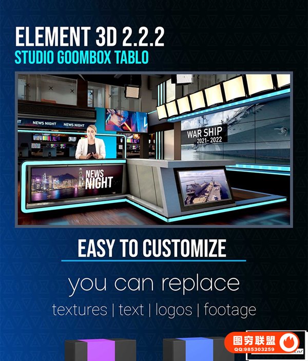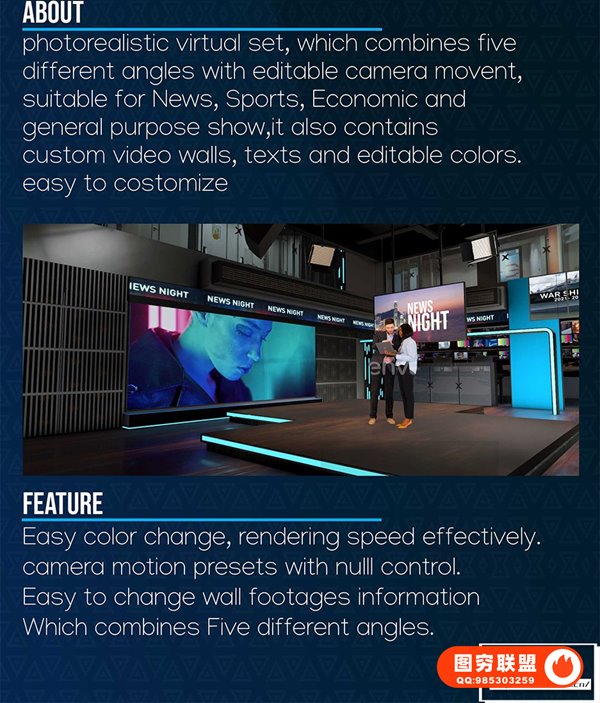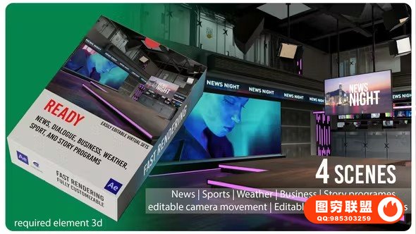这是一个逼真的虚拟演播室,适用于任何类型的节目,如新闻、对话、商业、天气、体育和故事节目。包含必需的 Element 3D 插件、地图和 Cinema 4D 文件、可编辑的摄像机视频以及可轻松更改的演示者。