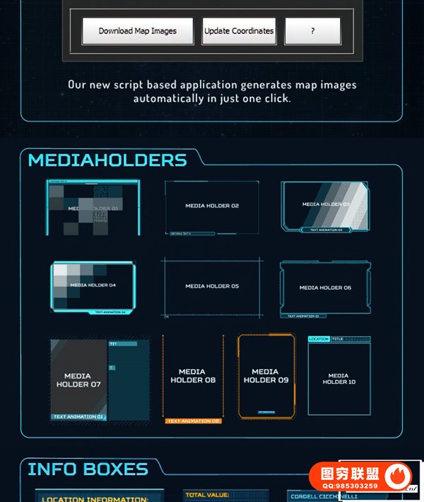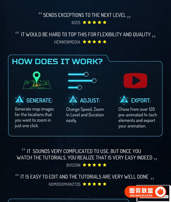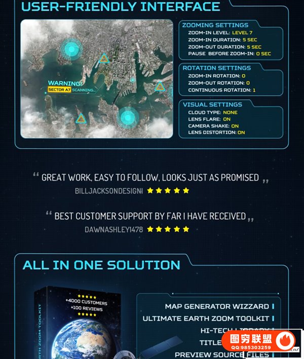 Ultimate Earth Zoom Toolkit:这是主模板。它结合了所有地图图像,让您可以缩放地球上的任何位置。它有一个简介(卫星场景)和一个结尾(徽标展示场景)。还包括高科技图形库。