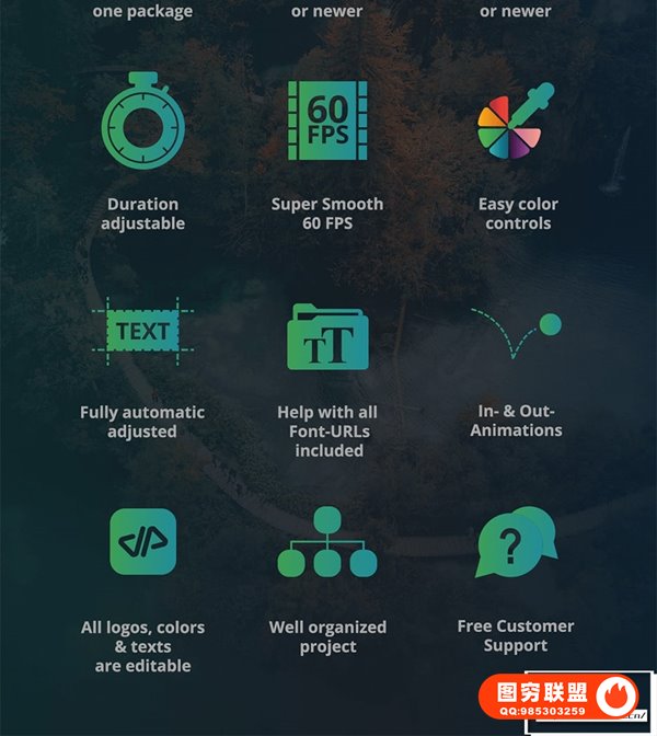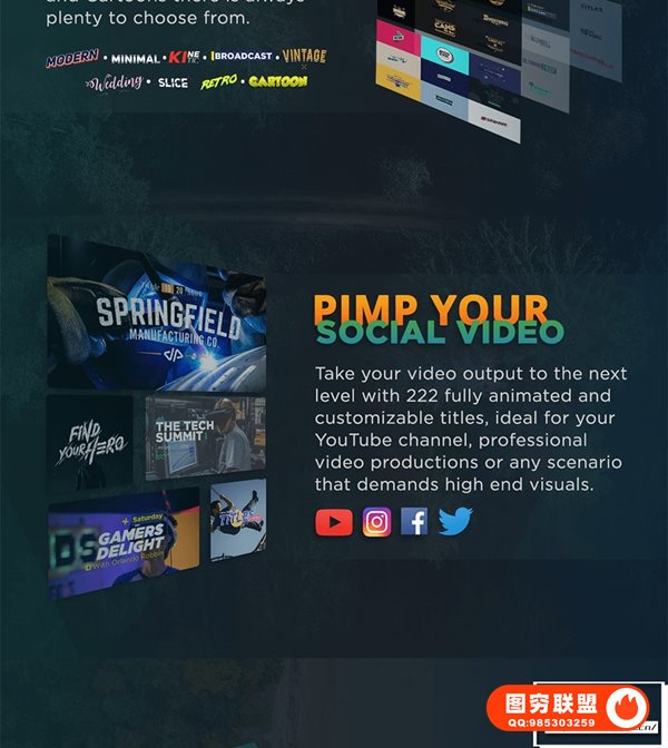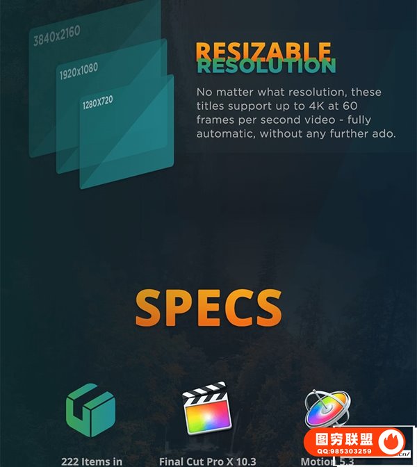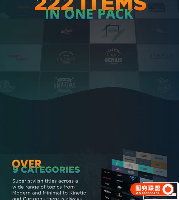 The Ultimate Titles Pack包含222个文字标题动画预设,9种类别,支持中文英文文字输入,可修改文字属性,颜色,大小,位置等,可设置纯色背景或透明背景,支持4K。