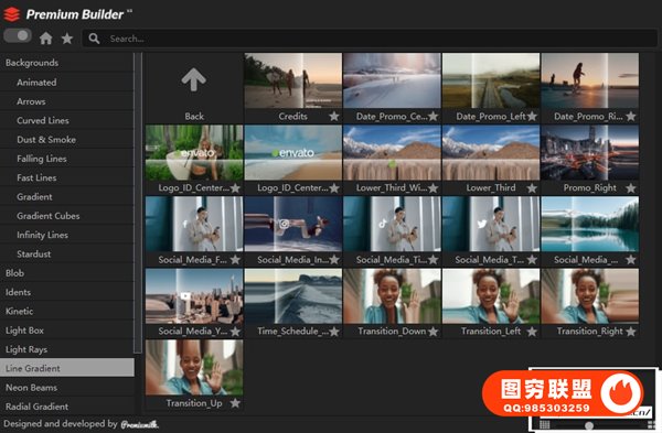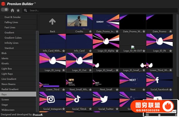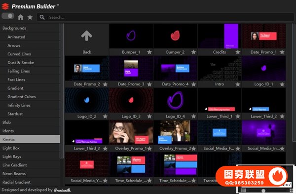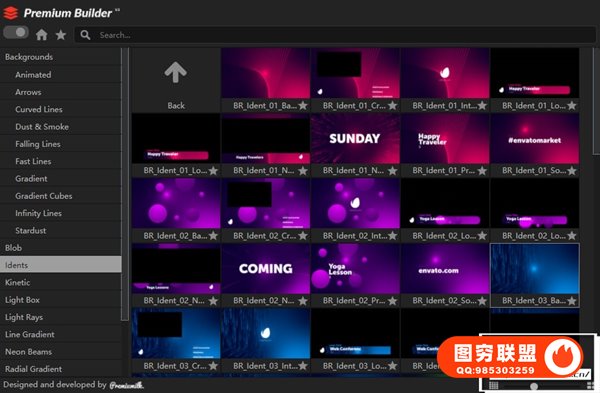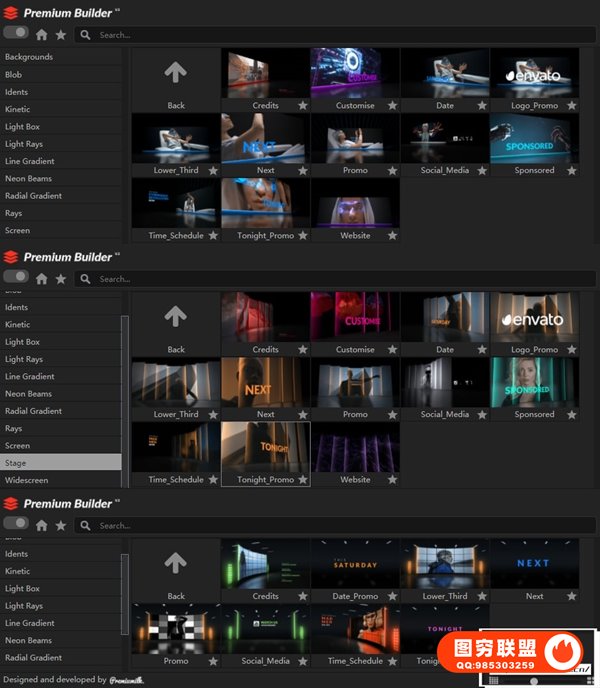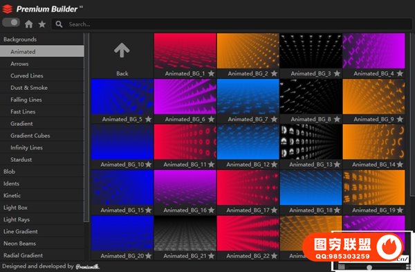 Broadcast Themes Pack 包含500多种现代抽象线条箭头图形渐变背景动画,可用于电视片头栏目包装动画元素。如:箭头图形、线条、粒子、光线、射线、舞台展示、Logo动画、产品盒子、渐变、图形遮罩等多种背景场景动画,由Premium Builder扩展脚本调用,可视化预览,需要哪个效果直接生成即可,十分简单,所有的文字,字体,颜色,Logo等基本参数都可以修改。包含类别:背景动画、背景箭头、背景曲线、背景灰尘和烟雾、背景下落的线条、背景快线、背景渐变、背景渐变立方体、背景无限线、背景星尘、广播主题 Blob、广播主题标识、广播主题动能、广播主题灯箱、广播主题光线、广播主题线渐变、广播主题霓虹灯、广播主题径向渐变、广播主题射线、广播主题画面、广播主题舞台、广播主题宽屏等。